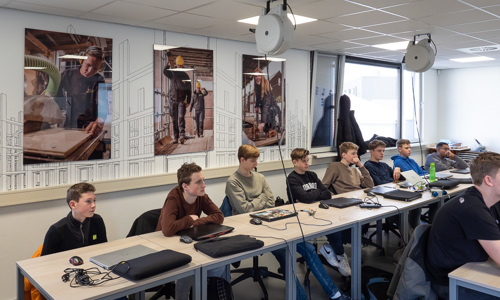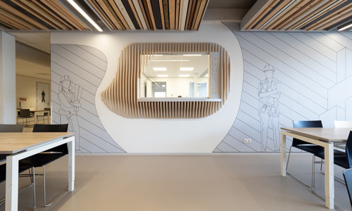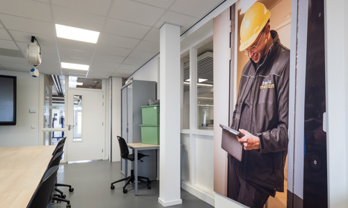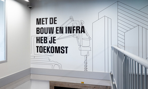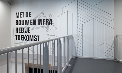 Bouwmensen wilde in het vernieuwde gebouw een uitstraling die past bij de branche en die gewaardeerd wordt door alle gebruikers van de ruimtes. Leerlingen, docenten en bezoekers moeten zich prettig voelen in een omgeving die past bij hun (toekomstige) werk en die ook laat zien dat technische beroepen een mooi perspectief bieden. JEU Interior Prints werd uitgenodigd om de visualisatie en de sfeer in het pand te vervolmaken.