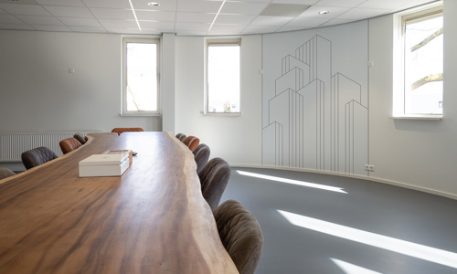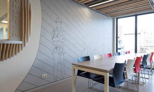 Na overleg over de verschillende concepten werd gekozen voor een licht en clean design voor de wandbekleding, in overeenstemming met de visuele identiteit van Bouwmensen. In het ontwerp is gewerkt met aansprekende beelden en met creatieve illustraties werd een intrigerend lijnenspel gecreëerd. Bijkomende eis was dat een deel van de beelden later op eenvoudige wijze gewisseld moet kunnen worden.