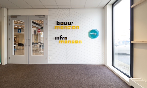 Voor de aankleding van de lokalen, algemene ruimtes en gangen gebruikten we diverse materialen zoals bedrukt Airtex behang, geplexificeerde prints op Dibond, peesdoek in frame en opvallende acrylaatletters.