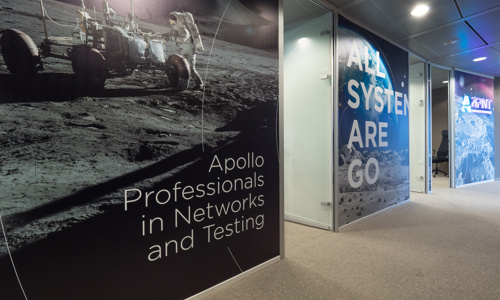 Bij JEU Interior Prints kregen we de mooie uitdaging om een uniek ontwerp te creëren voor de muren en glazen binnendeuren van het kantoor van APNT, een bedrijf dat zich richt op ontwikkeling, technologie en innovatie van ICT-netwerken. Het uitgangspunt was helder: de sfeer en branding van de APNT-website vertalen naar een inspirerende werkruimte waarin de medewerkers zich prettig voelen en die aantrekkelijk is voor jong talent.