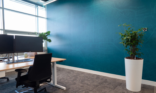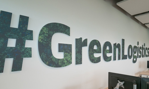 Naast de warehouse-faciliteiten bevindt zich in het nieuwe pand een aantal kantoorruimtes. Deze zijn, net als de al bestaande kantoren, door JEU voorzien van passende aankleding met print. Hierbij wordt, zowel in het design als in het materiaalgebruik, het duurzame karakter van het pand benadrukt. Zo is voor de contourletters op de wanden gebruik gemaakt van gerecycled PET-felt in plaats van het gebruikelijke acryl.