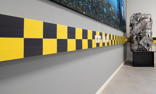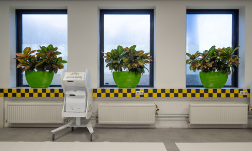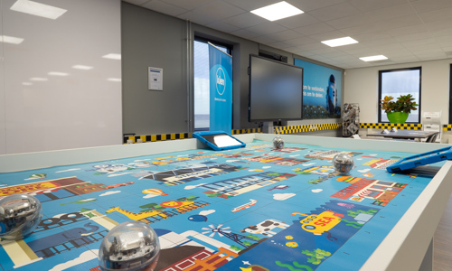 Om deze ruimte van een passende uitstraling te voorzien werd JEU ingeschakeld. In het ontwerp werd gebruik gemaakt van thema's en patronen uit de ICT-techniek en crash tests. Raamfolies bieden privacy en filteren het licht.